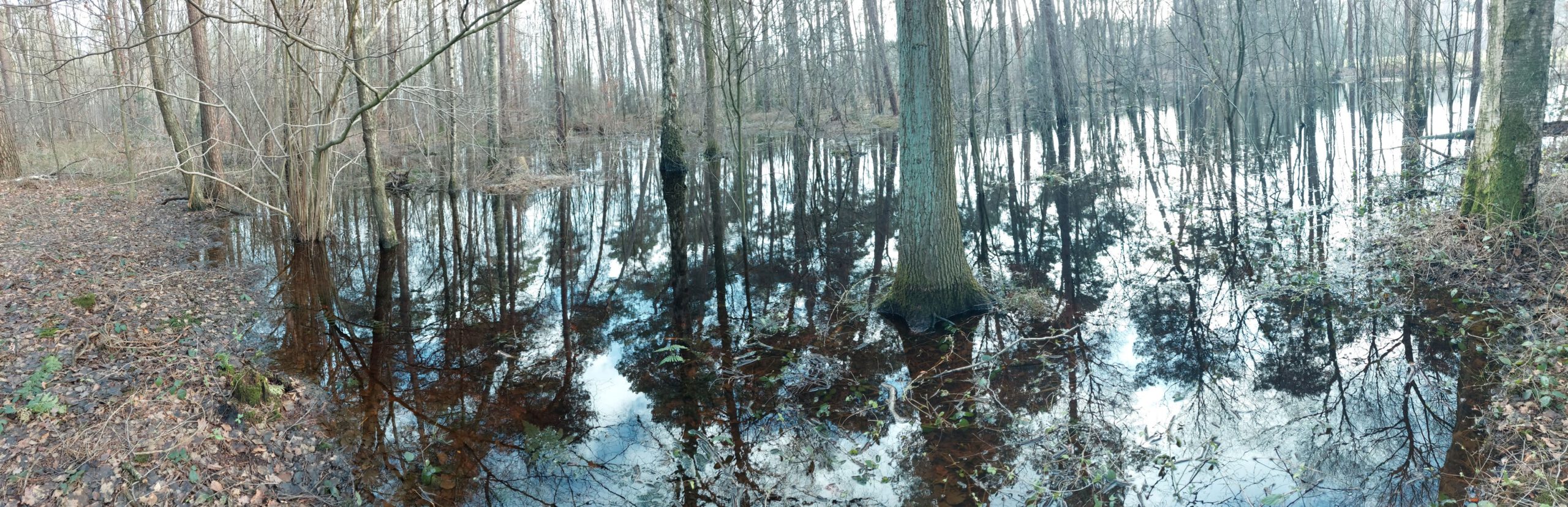 Die Waldgesellschaften variieren je nach Standort – mal trocken und fast dünenartig, dann wieder feucht oder nass, manchmal sogar staunass wie in diesem Bild. Die ertragreichen Regenfälle im Herbst und Winter 2023/24 haben die Grundwasserschichten aufgefüllt. In tiefer gelegenen Gebieten sammelt sich das oberflächennahe Grundwasser und bildet malerische „Waldseen“. Die Bäume sind derzeit noch in ihrer wohlverdienten Winterpause, aber die feucht-nassen Standorte sind nicht jedermanns Sache – hier haben die Erle und die Moorbirke deutliche Vorteile vor der Kiefer.
